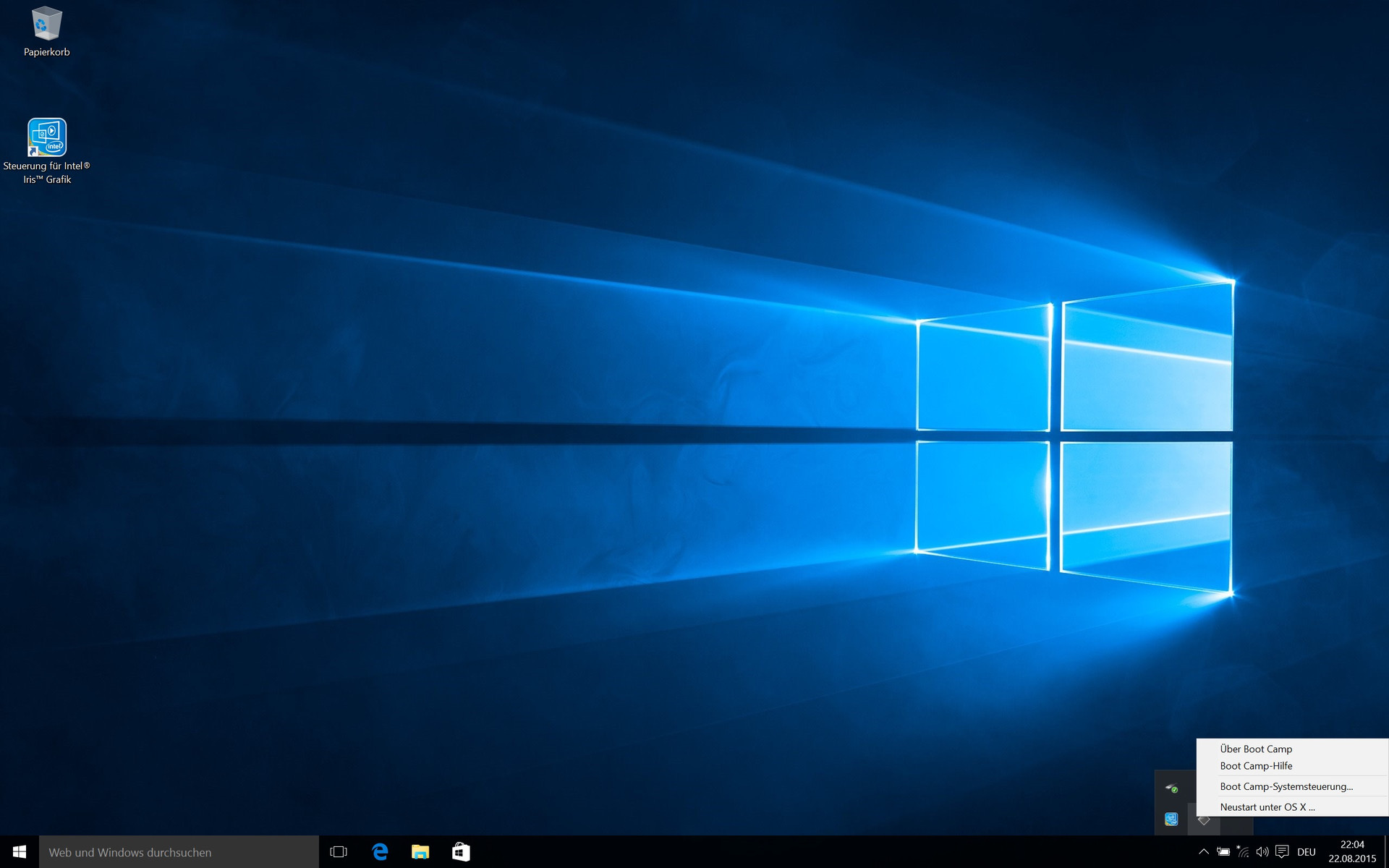Windows kann nach der Installation des Boot Camp Treibers ganz normal genutzt werden, wie man es auch von einem regulären Windows Notebook kennt. Alle nötigen Treiber inklusive WLAN, Bluetooth, Intel Iris Graphics usw. sind bereits installiert. Zusätzlich befindet sich in der Taskleiste das Boot Camp Symbol, über das man auch die Boot Camp Systemsteuerung erreichen kann. Dort ist es möglich, den Rechner unter Mac OS X neu zu starten und Einstellungen für die Tastatur (Abschaltung der Beleuchtung, standardmäßige Nutzung der F-Tasten) sowie das Touchpad vorzunehmen. Hierbei zeigt sich auch schnell eine große Schwäche der Bedienung, denn das Trackpad unterstützt lediglich Eingaben mit bis zu zwei Fingern. Andere Gesten mit mehr Fingern, die man von Mac OS X kennt, sind nicht möglich. Selbst einfach Gesten wie Pinch-to-Zoom klappen nicht. Zumindest über die Präzision und das Ansprechverhalten des Trackpads können wir nicht meckern, denn es funktioniert einwandfrei. Hier scheint es sich um eine künstliche Einschränkung durch Apple zu halten. Es ist daher empfehlenswert, eine externe Maus zu verwenden. In unserem Test konnten wir problemlos eine Bluetooth-Maus von Logitech benutzen.