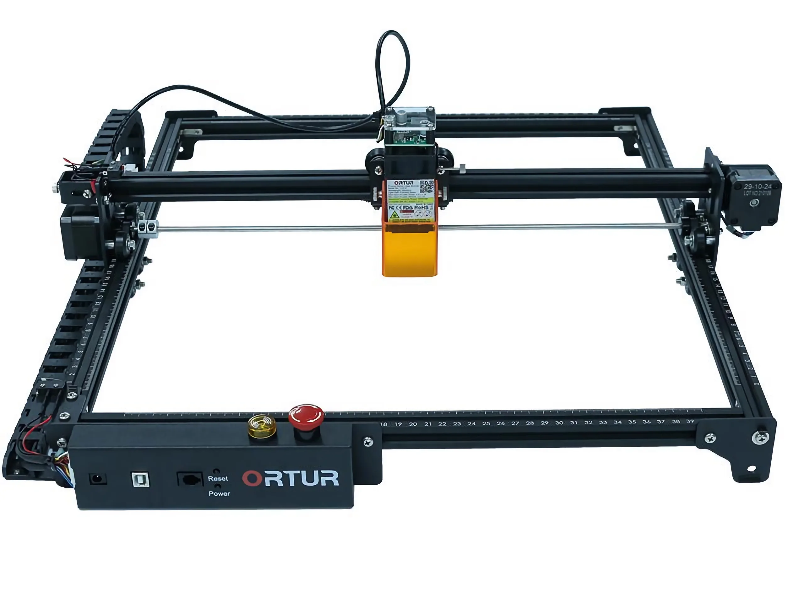 Ortur ist als Hersteller von Laser-CNC-Geräten schon lange kein unbekanntes Unternehmen mehr. Die Lasergravurgeräte des Produzenten zeichnen sich meist durch besondere Features aus, die man bei anderen vergeblich sucht. Auch beim Ortur Laser Master 2 Pro kommen einige Neuerungen im Vergleich zum Vorgänger, dem Laser Master 2 hinzu. Zumindest entlang der Y-Achse hat der neue Laser Master nun eine Kabelkette, die für weniger Ausfälle durch Kabelbrüche sorgen soll. Bei der Sicherheit hat sich auch etwas getan. Der Laser kann nun schnell über einen Notausschalter gestoppt werden, zudem sind Sensoren für Erschütterungen und Infrarotlicht hinzugekommen. Wird der Laser versehentlich bewegt, schaltet er sich selbstständig ab. Mithilfe des Infrarotsensors überprüft der CNC-Laser, ob das Werkstück eventuell Feuer gefangen hat. Auch dann wird eine Schutzabschaltung vorgenommen und ein Alarm ertönt.