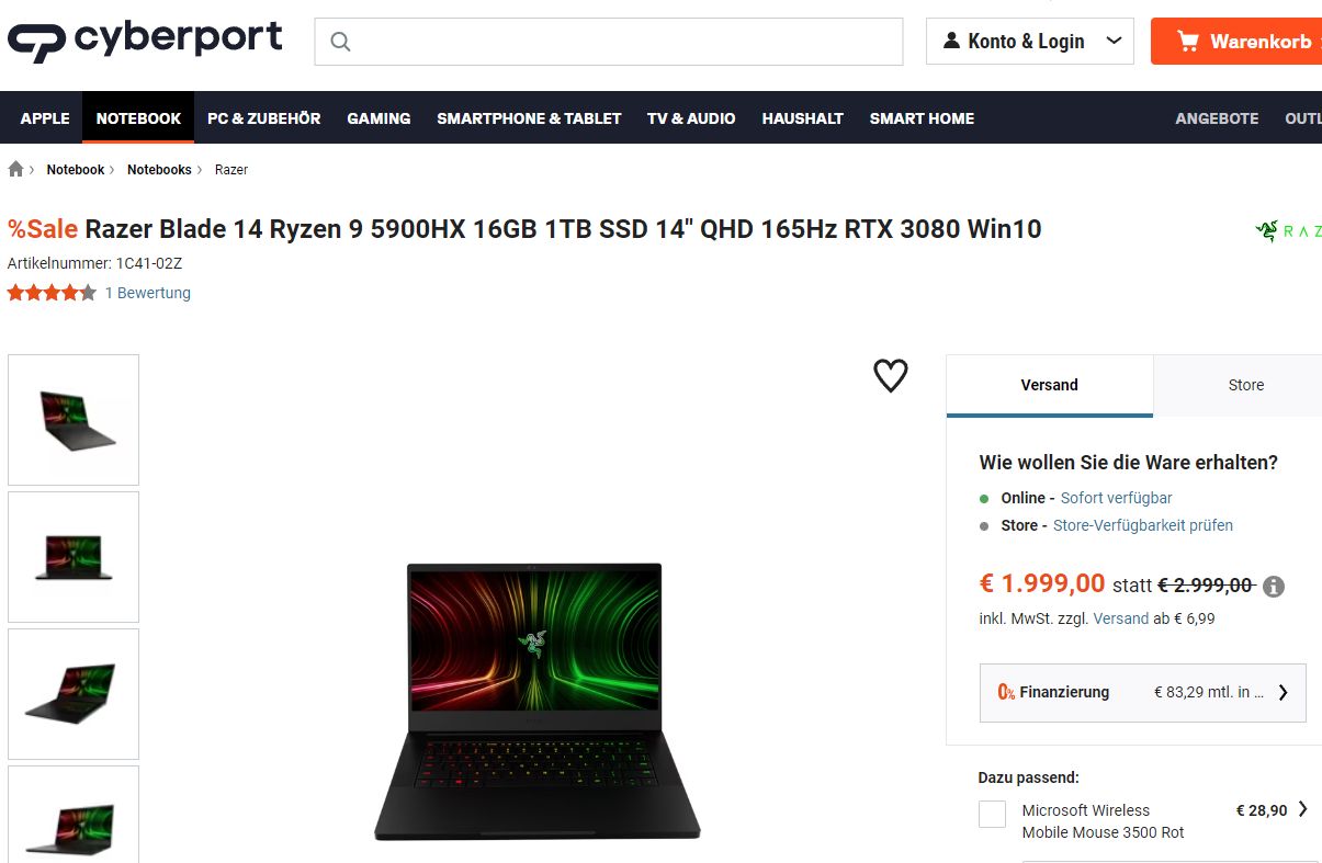 RTX-3080-Grafik im 14-Zoll-Gamer: Das kompakte Razer Blade 14 bietet nur wenig Grund zur Kritik und ist aktuell stark reduziert bei Cyberport für 1.999 Euro im Angebot. Laut Idealo lag der Preis zuvor bei 2.799 Euro – Razer-Produkte werden allgemeinhin teurer angeboten.