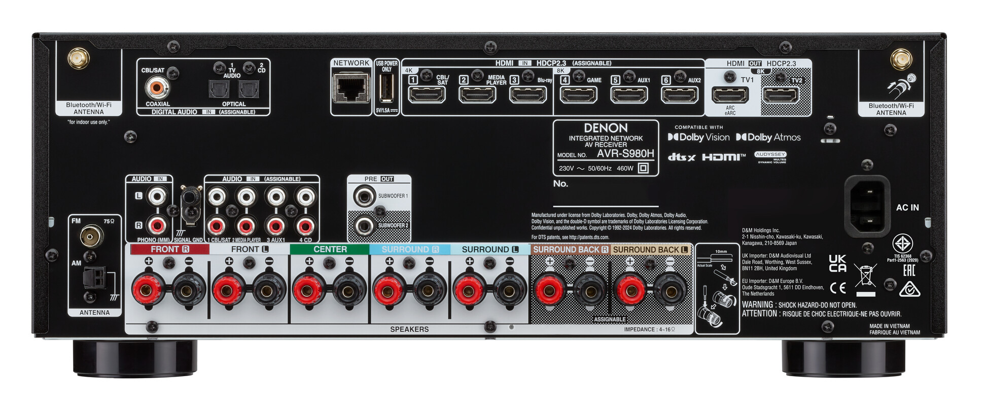 Denon verspricht für den AVR-S980H eine einfache Einrichtung in wenigen Schritten. So soll sich unkompliziert Heimkino-Sound ins heimische Wohnzimmer bringen lassen. Der AV-Receiver stellt hierfür 7.2 Kanäle zur Verfügung, kann im Zusammenspiel mit Dolby Atmos also beispielsweise in einem 5.2.2-Kanal-Setup mit zwei Subwoofern und zwei Deckenlautsprechern betrieben werden. Je Kanal stellt der Verstärker 90 Watt parat, was für Wohnzimmer-Heimkinos ausreichend Leistung darstellen dürfte.
