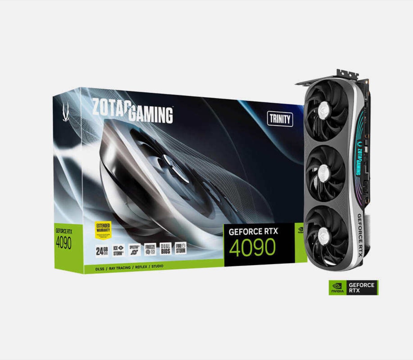Mit Boost-Taktfrequenzen von 2.595 MHz ist die KFA2 GeForce RTX 4090 SG auf dem Papier sogar etwas schneller als die Founders Edition, die laut Nvidia Taktraten bis 2.520 MHz erreicht, der Stromverbrauch bleibt bei 450 Watt (TBP). Zotac bietet mit der Trinity, der Trinity OC und der AMP Extreme gleich drei Versionen der GeForce RTX 4090 an, die zwischen 1.959 Euro und 2.049 Euro kosten.