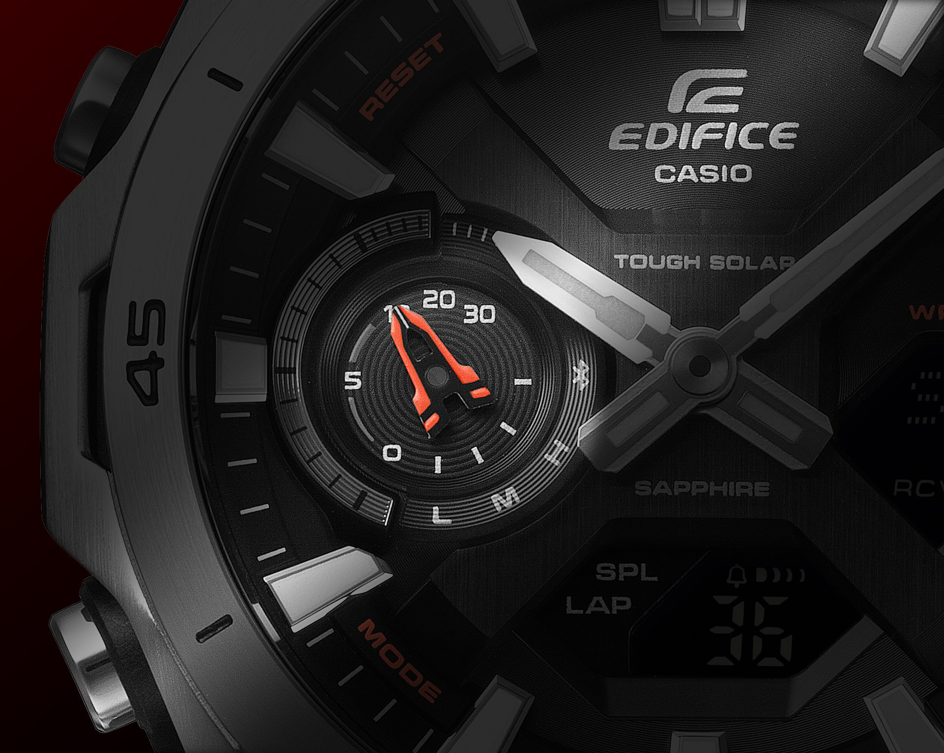 Bei genauer Betrachtung zeigt sich, dass die neuen Modelle trotz ihres technisch anmutenden Gehäuses ein deutlich schlankeres Profil besitzen als frühere Casio Edifice EQB-Modelle. Das Display-Layout, das ein analoges Zifferblatt mit einem kompakten Digitalfenster kombiniert, wirkt in der Realität klarer strukturiert und weniger tief eingelassen. Auf den Seitenaufnahmen ist zudem die matte Textur der schwarzen Ionenbeschichtung gut zu erkennen, die einen ästhetischen Kontrast zu den polierten Schraubendetails der Lünette bildet.
