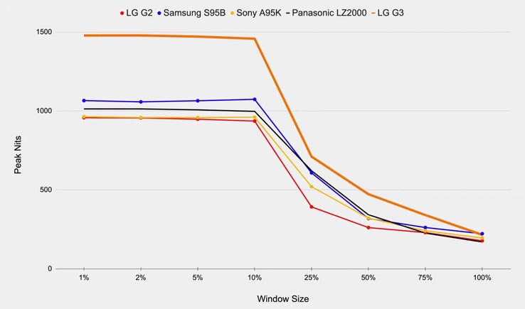 Konkret spricht HDTVTest von einer HDR-Spitzenhelligkeit von 1.448 Nits, wenn 10 Prozent des Bildschirms weiß ausgeleuchtet werden. Bei einem vollflächig weißen Bild steigt die Helligkeit immerhin auf 215 Nits. Da die Mikrolinsen das Licht fokussieren und so die Helligkeit erhöhen, sinkt der Stromverbrauch bei identischer Helligkeit im Vergleich zum G2 um rund 14 Prozent.