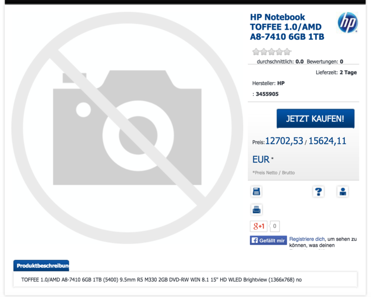 Das HP Notebook wird als "HP Notebook TOFFFEE 1.0" gelistet und bietet eine AMD A8-7410 APU, dedizierte AMD Radeon R5 M330 mit 2GB Speicher, 6 GB RAM, ein 15" HD WLED Brightview Display mit 1366x768 Pixeln Auflösung, ein DVD-RW Laufwerk und Windows 8.1.