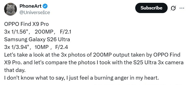 Anzumerken ist, dass am Galaxy S25 Ultra natürlich auch noch ein 5x Telefoto mit 50 Megapixel Sensor zur Verfügung steht. Wenn man also vor der Aufnahme in der Kamera-App vergrößert, wird man das 3x Telefoto gar nicht nutzen. Dennoch hat der Leaker mit seinem direkten 3x Telefoto-Vergleich natürlich in gewisser Weise einen Punkt. Aber kehren wir zu den Oppo Find X9 Pro Teasen zurück.