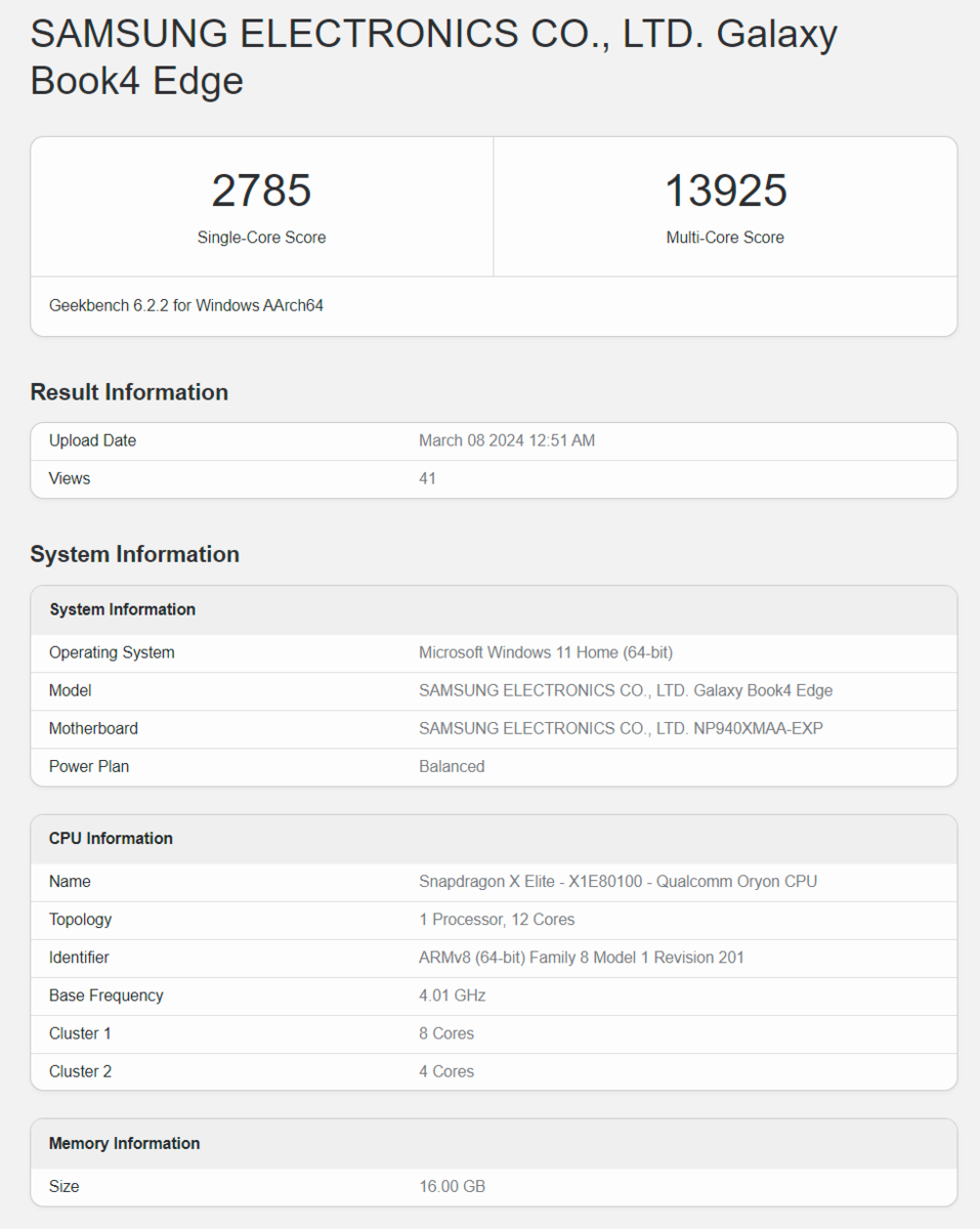 Erstmals wurde vor wenigen Stunden ein neues Samsung-Gerät mit dem Snapdragon X Elite auf Geekbench entdeckt, das sich als Galaxy Book4 Edge identifiziert. Im Gegensatz zu allen bisherigen Snapdragon X Elite Designs sind hier nur 16 GB RAM verbaut, was allerdings der Geekbench 6.2.2 Performance keinen Abbruch tut. Mit 2.785 Punkten im Single-Core-Test und 13.925 Punkten Multi-Core-Score liegt das Galaxy Book4 Edge deutlich näher an den Geekbench-Werten dran, die Qualcomm im Vorjahr für den Snapdragon X Elite postuliert hat.