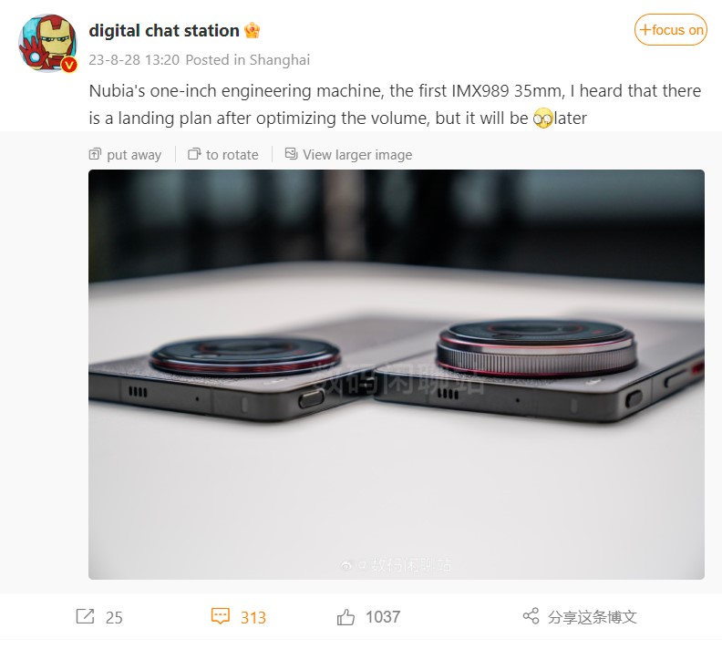 Wie der chinesische Leaker Digital Chat Station heute auf Weibo als Erster zeigte, arbeitet man bei Nubia aktuell an einem noch viel spannenderen Projekt. Im Bild unten (in voller Auflösung) soll laut Leaker ein Prototyp eines Nubia-Phones mit 1-Zoll Sony IMX989 und 35mm Optik zu sehen sein. Dass man bei diesem Plan die Physik nur schwer überlisten kann, zeigt der vergleichsweise dicke Kamerabuckel dieses Prototypen (rechts).