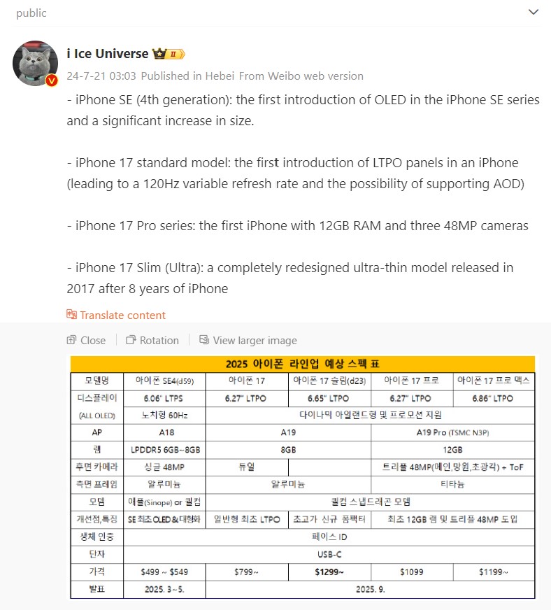 Ob das nun bedeutet, dass auch das iPhone SE 4 mit Dual-Cam auf den Markt kommt, wie manche auf Basis dieses Tipps spekulieren, ist unklar. Nachdem das neue iPhone SE ja erstmals auf das aktuelle iPhone-Design mit Face ID statt Touch ID setzen soll, könnte Apple durch die Zusammenlegung der Produktion mit den aktuellen iPhones potentiell Kosten sparen. Zum iPhone SE 4 äußerte sich an diesem Wochenende auch der bekannte chinesische Leaker Ice Universe, ebenfalls auf Weibo (siehe auch unten). Der veröffentlichte eine Tabelle mit allen fünf in 2025 geplanten iPhone-Modellen, darunter auch dem nächsten iPhone SE, das möglicherweise im März bis Mai 2025 auf den Markt kommt.
