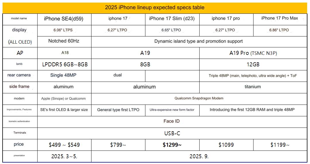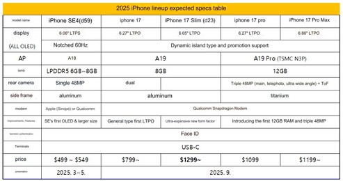 Der Tabelle zufolge (siehe unten maschinell übersetzt), die alle aktuell erwarteten Specs zum iPhone 17 Lineup und zum iPhone SE 4 zusammenfasst, wird die nächste iPhone Special Edition erstmals mit 60 Hz OLED-Display, Notch und Face ID auf den Markt kommen, konkret mit einem 6,06 Zoll LTPS Panel. Dazu gibt es offenbar einen Apple A18 Chip wie im demnächst startenden iPhone 16, eine einzelne 48 Megapixel Hauptkamera und 6 bis 8 GB LPDDR5 RAM im Aluminium-Gehäuse. Das ganze soll wohl zwischen 500 und 550 US-Dollar kosten.