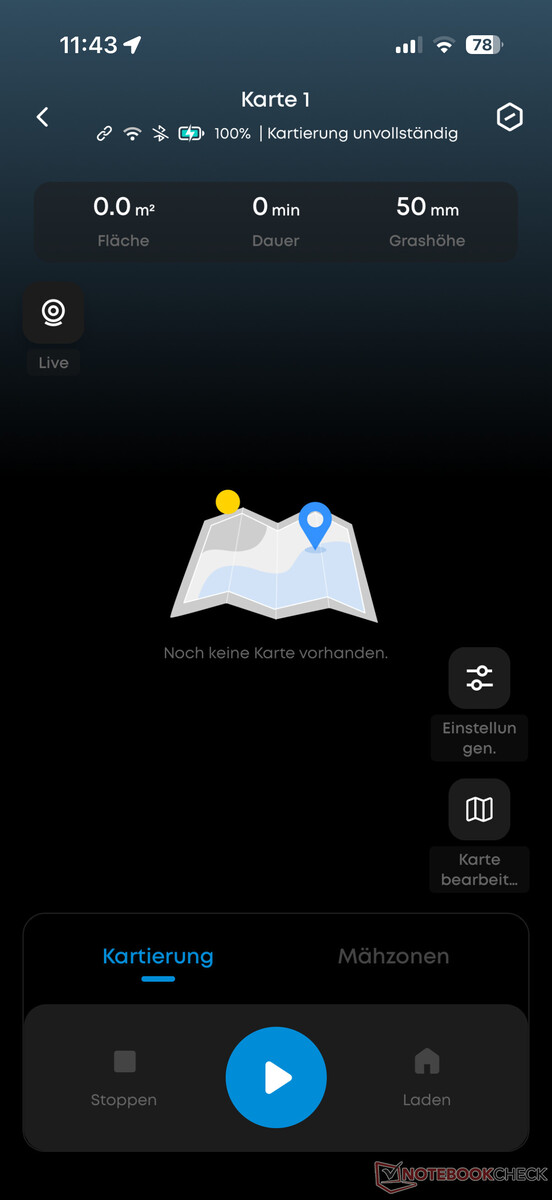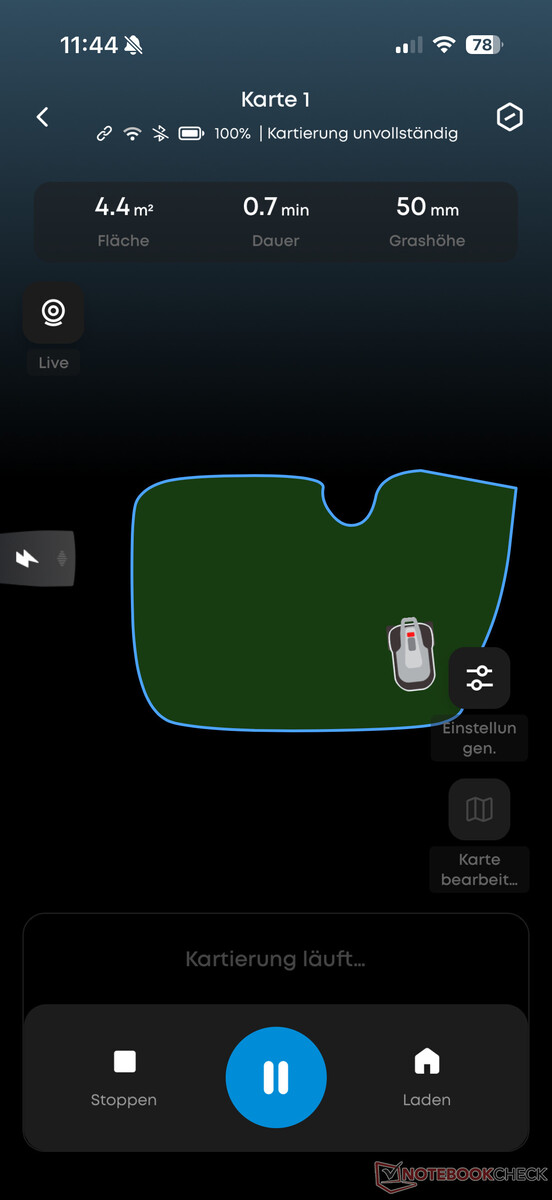 Während der Arbeit zeigt die App den Live-Fortschritt samt gemähter Quadratmeter (leider nicht in Prozent) und Dauer. Die automatisch erstellte Karte lässt sich durch Sperrzonen, Grasschneidezonen (zum Ignorieren von Hindernissen unter einer bestimmten Höhe) und Verbindungspfade zwischen mehreren Zonen anpassen. Auch ein Multi-Basis-Betrieb ist möglich, wenn Grasflächen nicht miteinander verbunden sind.