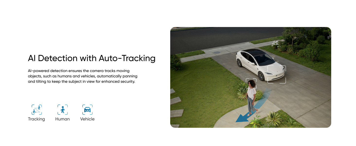 Es handelt sich um eine PTZ-Kamera, die eigentliche Kameraeinheit ist somit beweglich. Beworben wird die Möglichkeit zur KI-gestützten Verfolgung von Bewegung, die Drehung ist um 360° möglich. Die Kamera soll Bewegungen auch außerhalb des Aufnahmebereichs detektieren und sich dann entsprechend bewegen können, somit ergibt sich Herstellerangaben zufolge eine komplette Überwachung.
