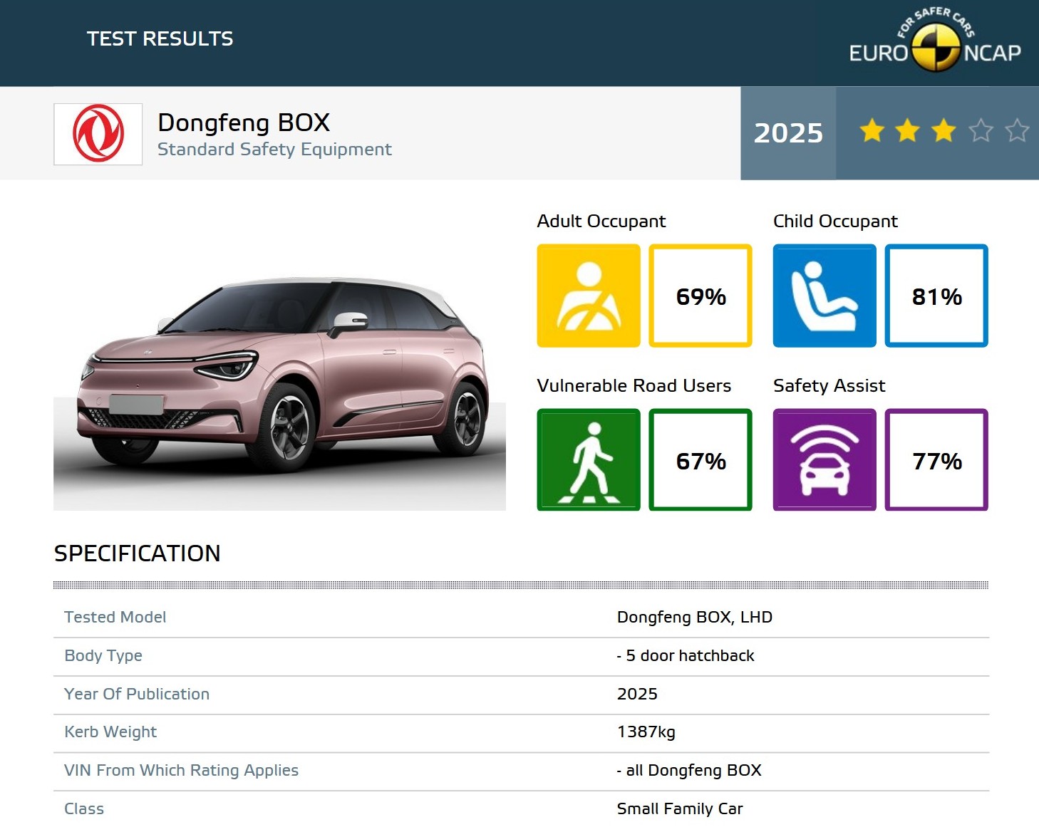 Der Dongfeng Box, ein günstiger E-Kompaktwagen des chinesischen Staatskonzerns Dongfeng Motor Corporation, musste sich mit drei von fünf Sternen begnügen. Dieses alarmierende Ergebnis geht vor allem auf massive Schwächen in der passiven Sicherheit zurück.