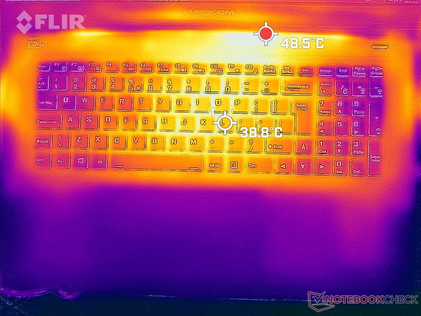 Die Oberflächentemperaturen sind in der Mitte der Tastatur am wärmsten, während die Handballenablagen viel kühler sind, um ein komfortables Spielen zu ermöglichen. Dünnere Laptops wie das Razer Blade 17 haben deutlich wärmere Handballenauflagen, die für die Hand unangenehmer sind.