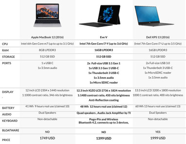 Über das Eve V 2-in-1-Tablet haben wir ja schon zwei mal berichtet. Vor einigen Wochen waren die Spezifikationen noch nicht ganz finalisiert, es war aber schon abzusehen, dass das V durchaus das Potential zu einem Surface-Killer haben könnte. Vor knapp 10 Tagen lagen dann die endgültigen Spezifikationen vor (unten noch einmal im Detail als Bild) und überzeugten vor allem durch die große Schnittstellenvielfalt, die hohe Akkukapazität und Details wie dem integrierten Fingerabdrucksensor oder dem flexibel verwendbaren Keyboard. Bis zuletzt war aber unklar, wie viel die drei Versionen mit bis zu 16 GB RAM und 512 GB SSD kosten würden.