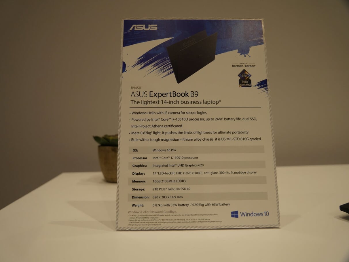 Das bereits zur IFA 2019 von Asus vorgestellte ExpertBook B9 bringt trotz Bildschirmdiagonale von 14 Zoll lediglich 870 Gramm auf die Waage und ist nur 14,9 Millimeter dick. Dabei ermöglicht der besonders dünne Rand eine Screen-to-Body-Ratio von 94 Prozent. Dadurch kann das mit 1.920 x 1.080 Pixeln auflösende 14 Zoll-Display in einem kleineren, von dem Abmessungen her eher an 13 Zoll-Notebooks angelehntes Gehäuse untergebracht werden.
