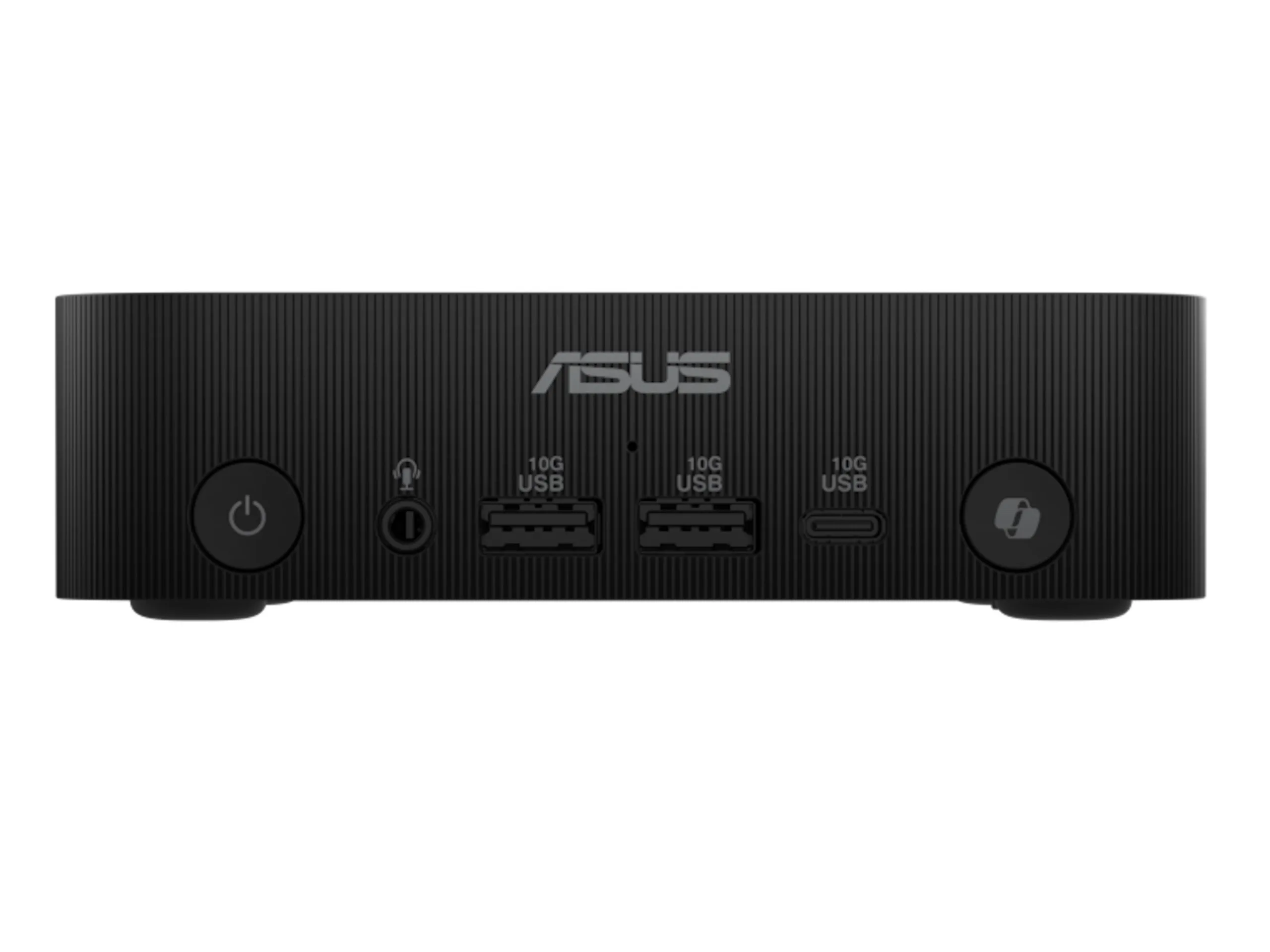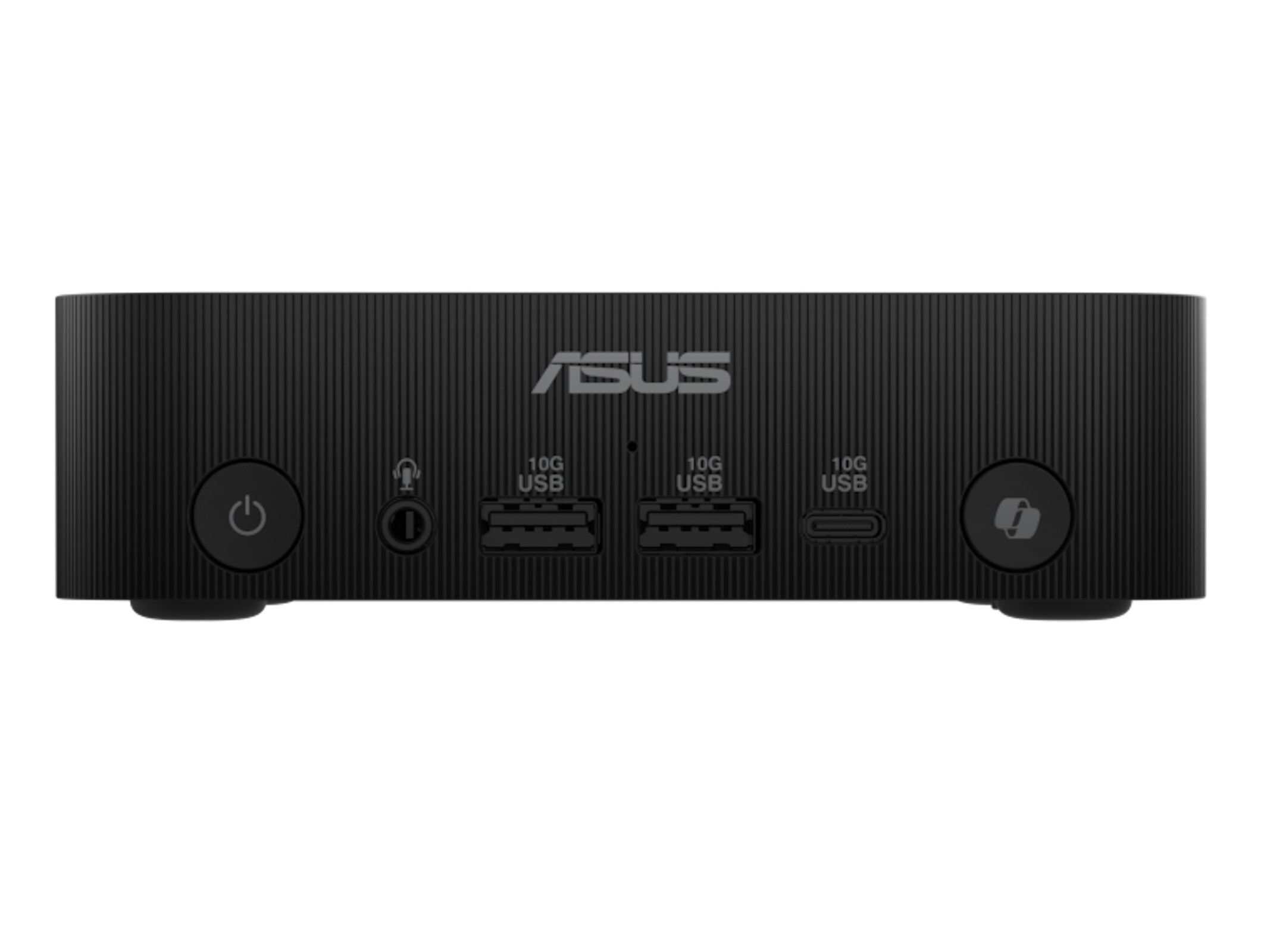 Der 130 x 130 x 34 Millimeter große Mini-PC ist offenbar mit einem etwas robusteren Gehäuse ausgestattet - oder zumindest hat Asus verschiedene MIL-STD-810H-Tests durchführen lassen, Luftfeuchtigkeit soll beispielsweise nicht sofort ein Problem darstellen - genauere Informationen fehlen aber noch. Relevant ist dies etwa, wenn das ExpertCenter PN54 auf Baustellen eingesetzt werden soll. An der Frontseite sind dreimal USB 3.2 Gen 2 zu finden, einmal davon im Typ C, dazu kommen noch eine kombinierte Klinkenbuchse und ein Fingerabdrucksensor, ein Anschalter und ein Copilot-Button für die KI-Nutzung.