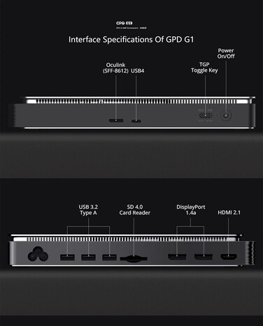 Ausgestattet ist das Grafikkartendock mit einem HDMI 2.1-Anschluss, der 4K@120 Hz-Ausgabe unterstützt, einem USB 4-Anschluss mit 65 W Ausgangsleistung sowie zwei DisplayPorts. So lassen sich bis zu drei Bildschirme für ein Multi-Monitor-Setup gleichzeitig anschließen. Zusätzlich zu USB4 weist das GPD G1 eine OCuLink-Schnittstelle mit bis zu 63 Gbit/s Bandbreite auf, um das Erweiterungsdock mit einem Computer zu verbinden. Dazu kommen noch diverse USB-A-Ports sowie ein SD-Kartenleser, die nur bei Anschluss an ein USB4-Hostgerät nutzbar sind. Das alles gibt es aktuell für nur 569 Euro.