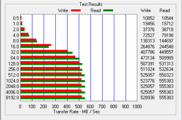 Im ATTO-Benchmark zeigt sich das von SSDs gewohnte Bild: Ab 32 respektive 64 KByte großen Daten kann auch die T5 ihre komplette Leistung abrufen.