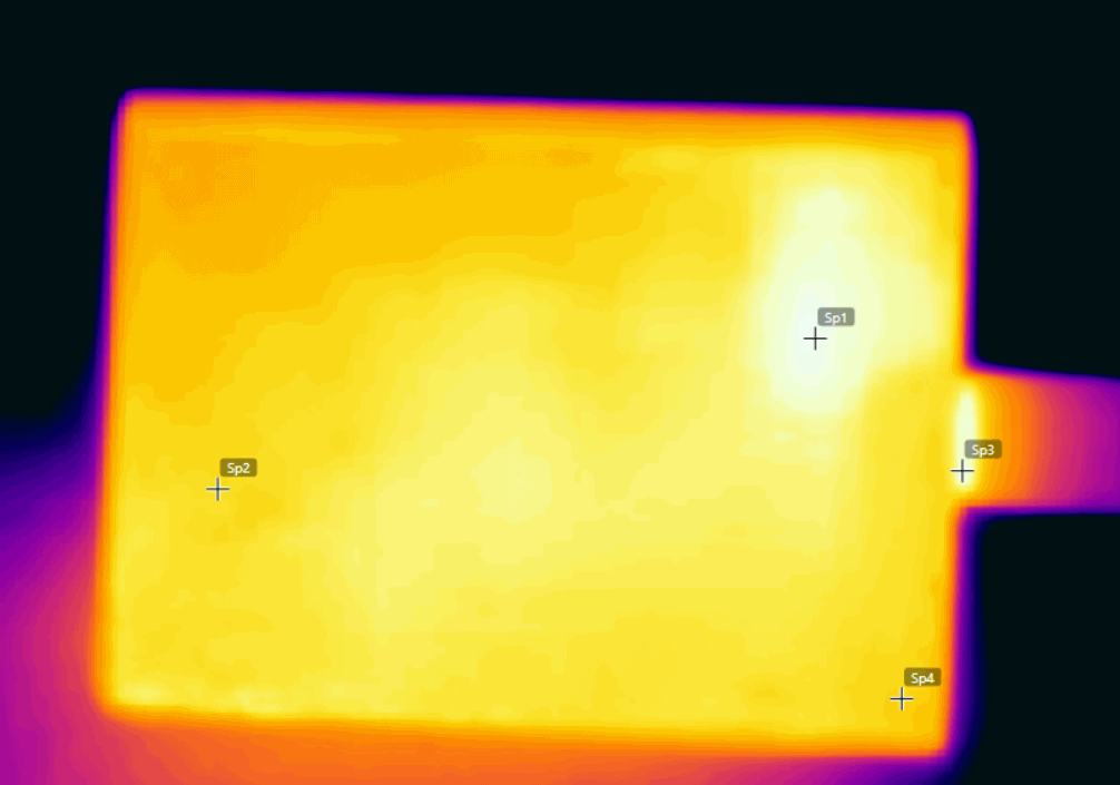 Dank des Metallgehäuses verhält sich die SSD T5 auch unter Vollast gutmütig: Im letzten Drittel des PCMark 8 Storage-Tests beträgt die Temperatur des Gehäuses 29,2°C (ausgemessen mittels Temperaturfühler), ganz gering ausgeprägte Hotspots sind lediglich im Bereich des Steckers und beim Controller via IR-Aufnahme zu identifizieren. Die Temperaturdifferenz beträgt allerdings weniger als ein Kelvin.