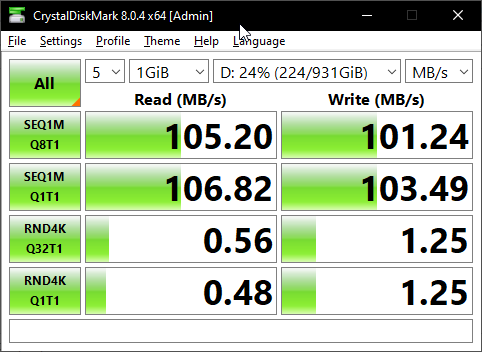 Diese Funktionen sind nett, aber der Hauptgrund für die Verwendung einer externen SSD ist die hohe Übertragungsrate, die das Laufwerk bieten kann. Hier liefert das Dockcase Gehäuse. Es unterstützt USB 3.2 Gen 2, das eine theoretische Geschwindigkeit von bis zu 10 Gbit/s bietet. Das entspricht etwa 1.250 MB/s.