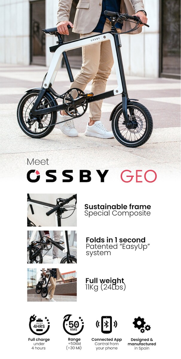 Hinter dem Projekt steckt der spanische Hersteller Ossby, der bereits eine Reihe von E-Bikes auf den Markt und die Straße gebracht hat. Das neue Ossby Geo ist hierbei eine besonders nachhaltige Mobilitätslösung für die Stadt. Das E-Faltrad setzt auf einen möglichst geringen ökologischen Fußabdruck. Daher greift der Hersteller bei der Produktion des ungewöhnlich geformten Rahmens auf einen Verbundwerkstoff aus recycelten Fasern und pflanzlichen Harzen zurück. Dennoch soll dieser so stabil wie ein Rahmen aus Aluminium sein.