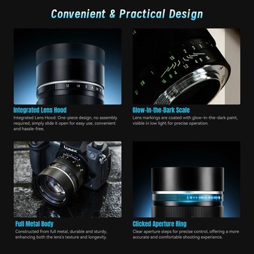 Das neueste Objektiv von 7Artisans setzt auf ein relativ kompaktes Metallgehäuse – das Objektiv ist 6,8 Zentimeter lang bei einem Durchmesser von 6,2 Zentimetern und einem Gewicht von 410 Gramm. Das Metallgehäuse besitzt eine ausziehbare Streulichtblende, ein 55 Millimeter Filter-Gewinde und eine Beschriftung, die im Dunkeln leuchtet, damit diese stets lesbar bleibt.