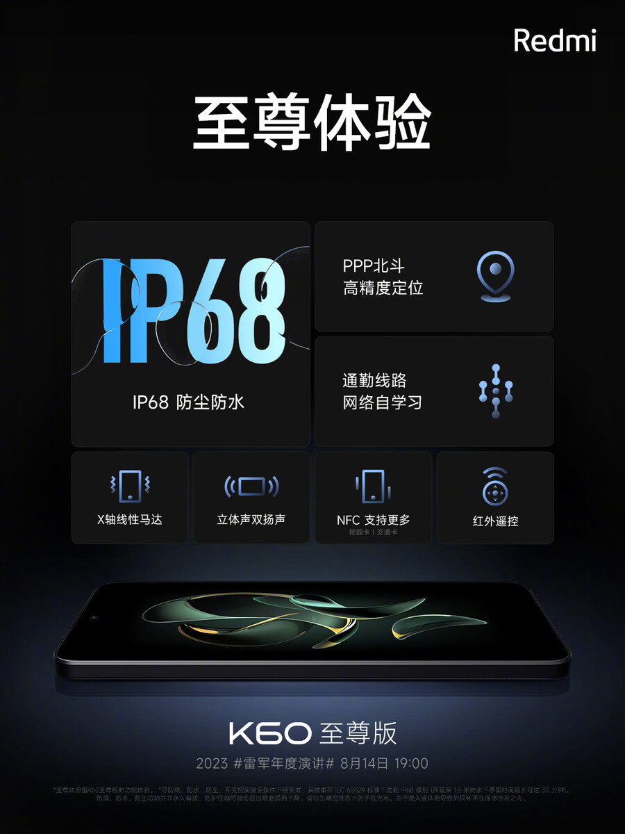 Durchaus erwähnenswert ist, dass Xiaomi das Redmi K60 Ultra erstmals in der Redmi-Familie nach IP68 staub- und wasserdicht gemacht hat, bisher war dieses Feature den teureren Xiaomi-Flaggschiffen vorbehalten. Damit kann man die "Extreme Edition" bis zu 30 Minuten lang in maximal 1,5 Meter Süßwasser untertauchen.