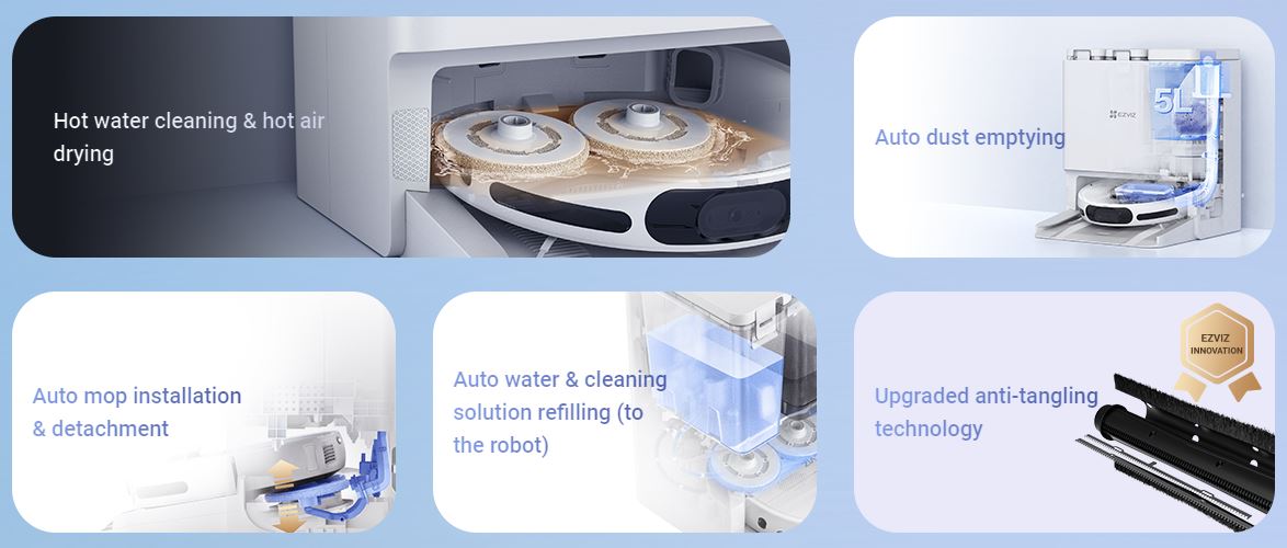Zur Verfügung steht eine Reinigungsbürste für die trockene Reinigung, wobei Kämme eine Beeinträchtigung des Betriebs durch Haare verhindern sollen. Seitenbürsten stehen bereit, die Saugleistung wird mit 7.200 Pa angegeben. Die feuchte Reinigung erfolgt mit 180 Umdrehungen in der Minuten und einem Anpressdruck von 10 Newton. Die Reinigung von Kanten soll durch einen ausfahrbaren Wischmopp möglich sein. Erkennt der Wischroboter einen Teppich, so kann dieser die Wischmopps in der Basisstation zurücklassen. Die Navigation erfolgt mittels LiDAR, Hindernisse sollen sich durch eine Kamera mit AI-Unterstützung erkennen lassen.