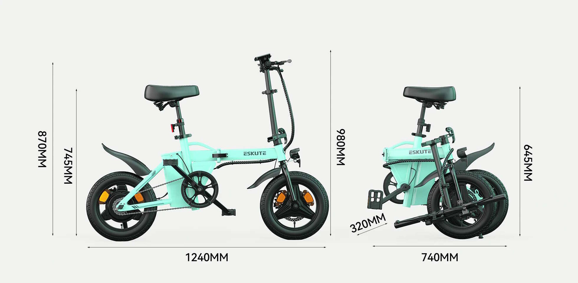 Ausgestattet ist das mit 21 Kilogramm nicht extrem leichte E-Bike vorn und hinten mit 14 Zoll großen und 2,15 Zoll breiten Reifen - recht typisch bei faltbaren E-Bikes sind 20-Zoll-Reifen. Der in die Hinterradnabe montierte Motor bringt es auf eine Leistung von 250 Watt und soll bis zu einer Geschwindigkeit von 25 km/h unterstützen, angegeben wird ein niedriges Drehmoment in Höhe von 25 Nm. Die Akkukapazität ist mit 324 Wh sogar noch vergleichsweise ordentlich, angegeben wird eine maximale Reichweite von 60 Kilometern.