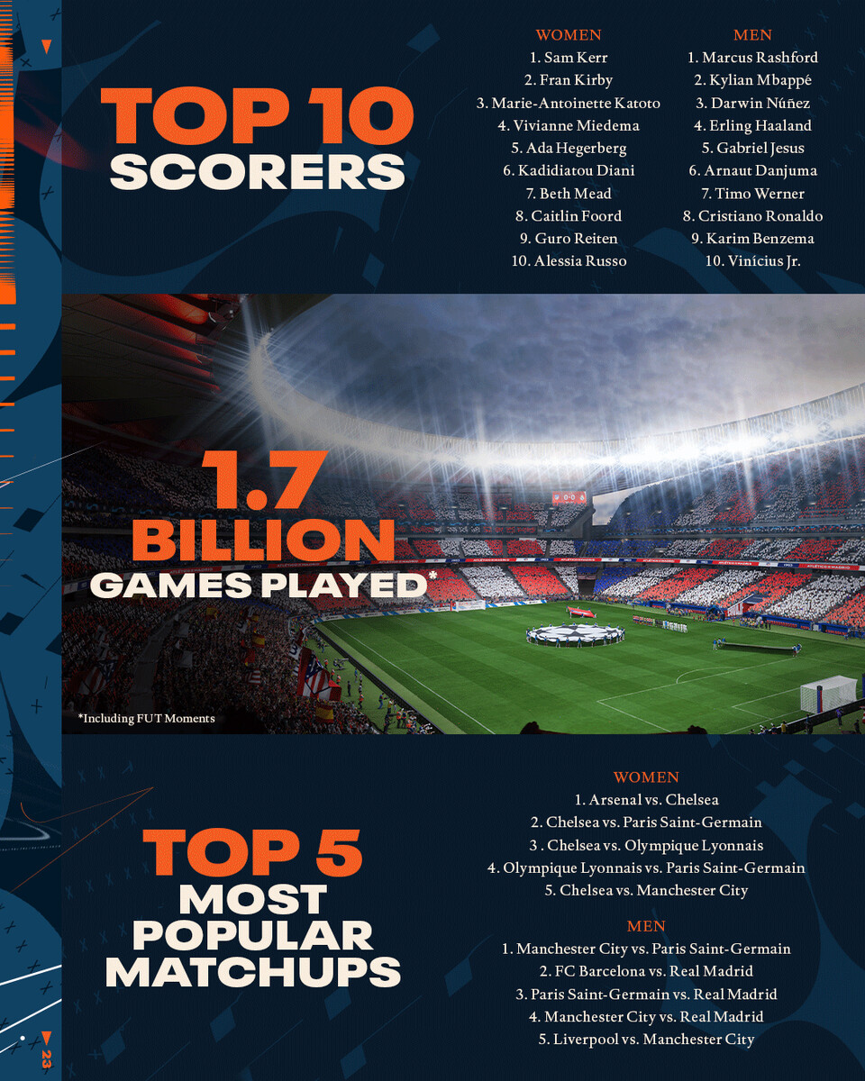 Die Frauenmannschaft von Chelsea rund um Cover-Star Sam Kerr ist das am häufigsten ausgewählte Frauenteam in FIFA 23. Bei den Männern belegen die Kicker von Manchester City unangefochten die Spitzenpositionen in FIFA 23. Das beliebteste FIFA-23-Matchup beinhaltete ebenfalls Manchester City als Gegner von Paris Saint-Germain.