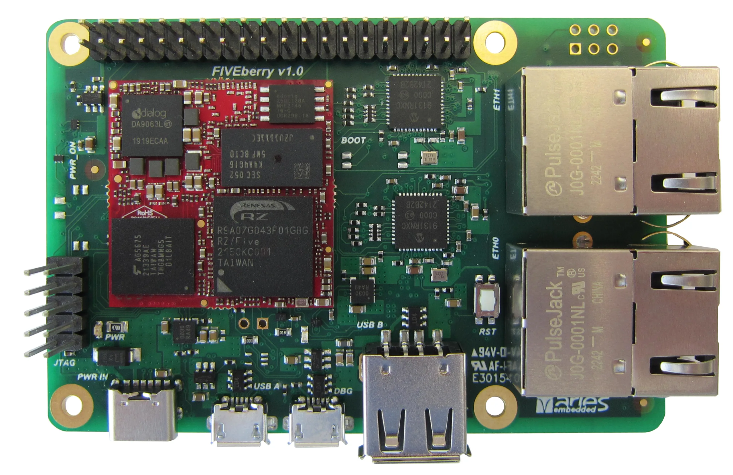 Beim FIVEberry von Aries handelt es sich um einen neuen Einplatinenrechner mit einem RISC-V-Prozessor. Konkret kommt ein Prozessor mit einem einzelnen AX545MP-Rechenchip zum Einsatz. Dieser soll mit bis zu einem Gigahertz takten und kann auf einen 512 Megabyte großen Arbeitsspeicher zugreifen. Auf einen internen Speicher müssen Nutzer - bei Einplatinenrechnern nicht unbedingt ungewöhnlich - verzichten, ein microSD-Kartenslot ist vorhanden. Auf diesem kann dann ein Betriebssystem installiert werden.