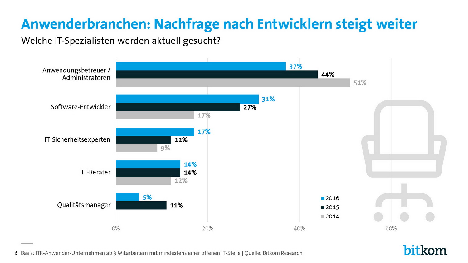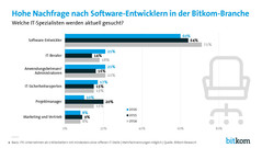 Neben Entwicklern von Software suchen die ITK-Unternehmen in Deutschland mit 21 Prozent auch verstärkt IT-Berater. Vor einem Jahr waren es nur 14 Prozent. Gefragt sind darüber hinaus Anwendungsbetreuer und Administratoren (21 Prozent) sowie IT-Sicherheitsexperten (17 Prozent). Bei den Anwenderunternehmen sind aktuell 30.500 Stellen für IT-Experten unbesetzt. Dabei geht die Nachfrage nach Anwendungsbetreuern und Administratoren zurück (von 44 Prozent auf 37 Prozent der Unternehmen mit offenen IT-Stellen), der Bedarf an Software-Entwicklern steigt dagegen weiter (von 27 Prozent auf 31 Prozent).