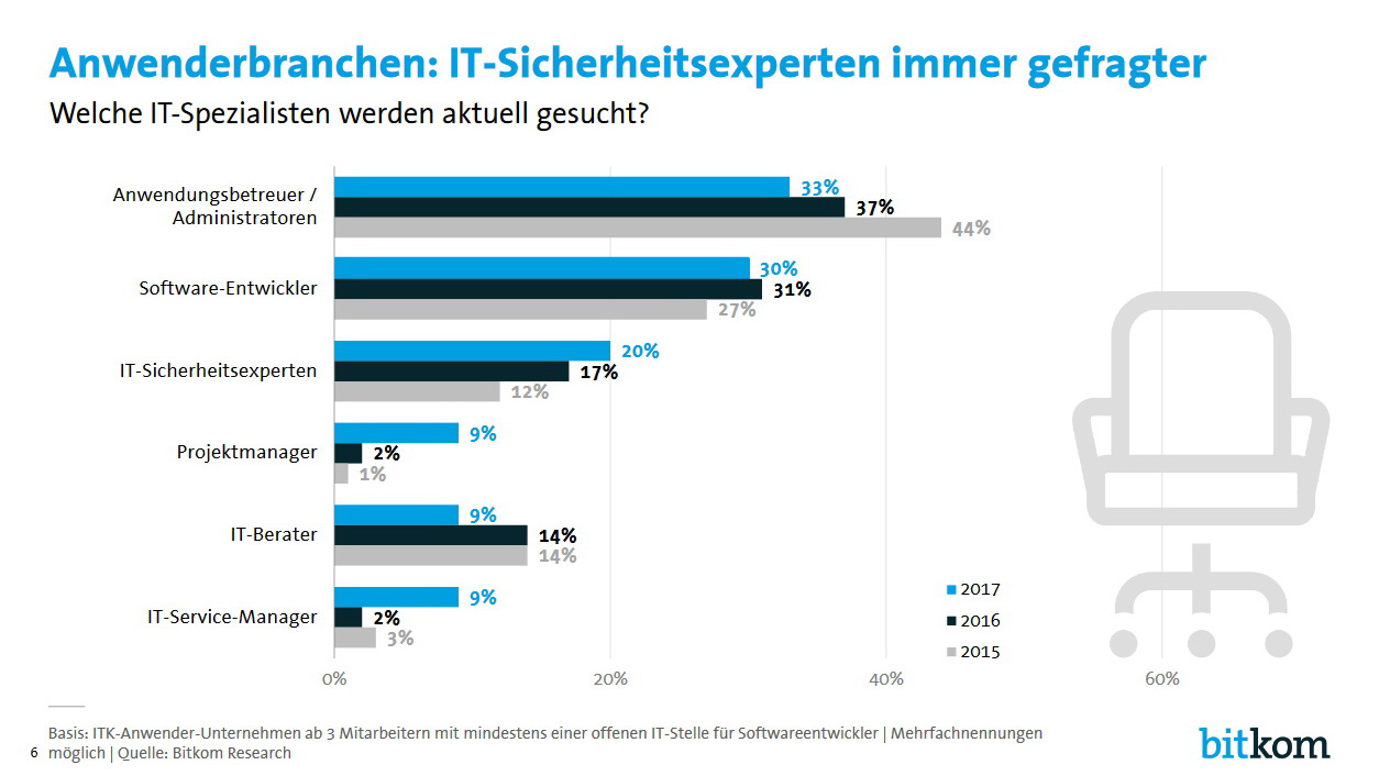 Bei den übrigen 31.500 freien Stellen für IT-Fachkräfte sind vor allem Administratoren weiterhin am stärksten gefragt (33 Prozent), gefolgt von Softwareentwicklern (30 Prozent) und IT-Sicherheitsexperten (20 Prozent). Neben der anhaltend hohe Nachfrage nach Softwareentwicklern quer durch alle Branchen gibt es laut Bitkom außerdem einen branchenübergreifend steigenden Bedarf an IT-Sicherheitsexperten.