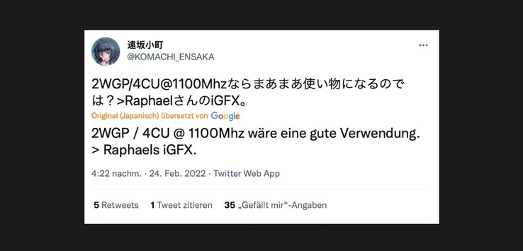 Gestern hat der bekannte Leaker @KOMACHI_ENSAKA in einem Tweet angegeben, dass AMD Ryzen 7000 "Raphael" eine iGPU auf Basis der RDNA 2-Architektur erhalten könnte, die nur 4 Compute Units mit Taktfrequenzen von 1.100 MHz besitzen sollte.
