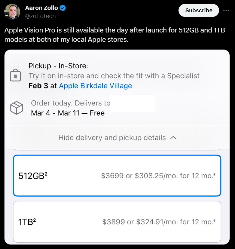 Der YouTuber Aaron Zollo (@zollotech) twitterte am Tag nach der Markteinführung, dass die beiden Vision Pro-Geräte mit höherer Kapazität noch in den Geschäften zur Abholung bereit stünden. Zum Zeitpunkt des Verfassens dieses Artikels war dies jedoch nicht mehr der Fall, da die Abholung in den Geschäften nicht mehr möglich war und die Lieferzeiten für alle Modelle auf 5-6 Wochen gesunken sind. Obwohl die Vision Pro nur in den USA erhältlich ist, hat Apple einen Hype um das Gerät erzeugt und verkündet, dass es die "Ära des räumlichen Computings" einläutet.