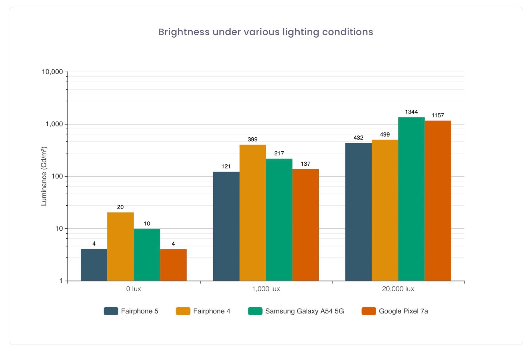 Fairphone bewirbt eine Spitzenhelligkeit von 880 Nits, was allerdings nur punktuell für die Darstellung von HDR-Inhalten gilt. DxOMark misst bei Sonnenlicht gerade einmal 432 Nits, wodurch das Display im Freien schwer zu lesen ist. Ein grüner Farbstich und teils verzögerte Touchscreen-Reaktionen beim Zocken sorgen dafür, dass das Display trotz hoher Farbtreue ein Resultat von nur 110 Punkten erzielt.