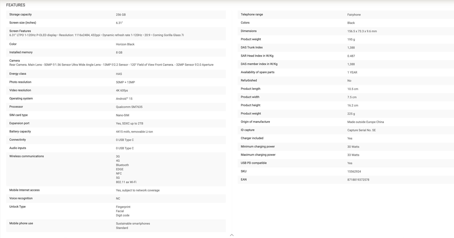 @MysteryLupin hat nun auch noch ein geleaktes Datenblatt ins Netz gestellt, das einige Details ergänzt, etwa die Maße. Das Fairphone 6 misst demnach 156,5 x 73,3 x 9,6 mm und ist demnach gleich dick aber in Breite und Höhe tatsächlich kompakter als der Vorgänger mit 161,6 x 75,83 mm. Das Gewicht schrumpft ebenfalls von 212 Gramm auf 195 Gramm. Der Akku ist weiterhin entfernbar, ein Fingerabdrucksensor dient zum sicheren Entsperren. Das Fairphone 6 wird mit Android 15 ausgeliefert.