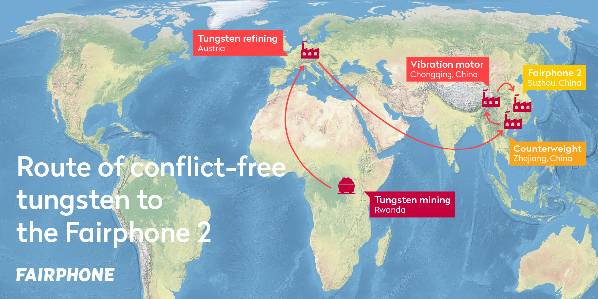 Seit Beginn dieses Jahres ist Fairphone der erste Produzent von Unterhaltungselektronik der Fairtrade Gold in seine Liefer- und Produktionskette integrieren konnte. Parallel zu dem Pilotprojekt "Fairtrade Gold" konnte in einer engen Zusammenarbeit mit dem österreichischen Spezialisten Wolfram Bergbau und Hütten AG, das gewinnen und sintern von Wolfram, aus einer Mine in Ruanda aufgebaut werden.