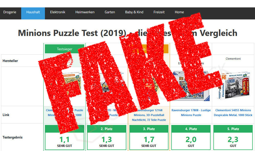 Bei Googles Suchmaschine landen die Fake-Tests und Fake-Test-Portale in der Suche im Ranking ganz oben, seriöse Quellen haben das Nachsehen. Um das Verwirrspiel für den Verbraucher komplett zu machen: Auch prominente Medien und bekannte Medien machen bei der Verbrauchertäuschung fleißig mit, binden ominöse Fake-Test-Portale teilweise sogar einfach in ihre Webseiten ein.
