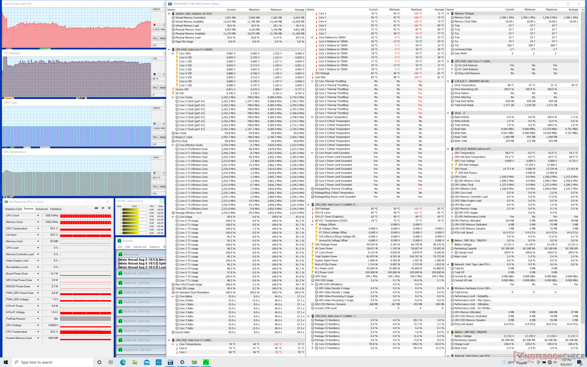 Unter Prime95-Last steigt die Taktfrequenz für eine bis zwei Sekunden auf 4,1 GHz, wonach sofort eine Kerntemperatur von 100 °C erreicht wird. Die Taktfrequenz fällt dann auf den 2,4-bis-3,2-GHz-Bereich, um eine vernünftigere Temperatur von 83 °C halten zu können.