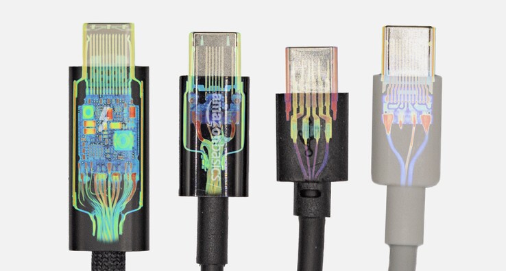 Ein Vergleich mit einem Amazon Basics USB-C-Kabel, das nur USB 2.0 und Ladevorgänge bis 60 Watt unterstützt, zeigt, wie viel Komplexität bei einem derart günstigen Kabel eingespart werden kann. Der Stecker selbst besitzt nur 12 statt 24 Pins, das Kabel besteht aus 5 statt 20 Drähten, das Mainboard des passiven Kabels dient nur zur Verbindung der Stecker-Pins mit den Drähten. Ein NiceTQ USB-C-Kabel, das Geschwindigkeiten bis 10 Gbit/s unterstützt, verzichtet gleich ganz auf ein Mainboard, und verbindet die Pins des Steckers einfach direkt mit den Drähten.