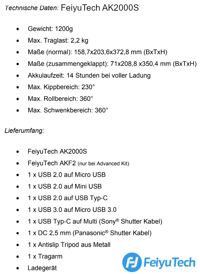 Der FeiyuTech AK2000S ist ab Anfang Dezember erhältlich. Es gibt ihn in zwei Varianten: Das AK2000S Standard Kit hat einen UVP von 369 Euro. Das AK2000S Advanced Kit beinhaltet neben dem Gimbal auch den FeiyuTech AKF2, ein Tool zur automatischen Fokussteuerung (Follow Focus). Es wird über den Blitzschuh der Kamera oder am Fixboard des Gimbals montiert und ist mit einem bürstenlosen Motor mit Objektivring ausgestattet. Die unverbindliche Preisempfehlung hierfür liegt bei 429 Euro.
