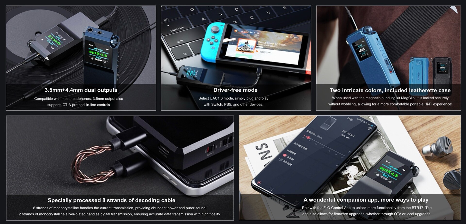 Durch einen ESS Sabre ES9069Q DAC und einen 650 mW Verstärker soll erstklassiger Klang sichergestellt werden, und zwar auch in Verbindung mit anspruchsvolleren Kopfhörern. Alternativ können auch Bluetooth-Kopfhörer angebunden werden, wobei der FiiO BTR17 durch den Qualcomm QCC5181 Bluetooth-Chip neben Sony LDAC auch Qualcomm aptX Lossless unterstützt, sodass Musik in CD-Qualität verlustfrei gestreamt werden kann. Das rund 73 Gramm leichte Gadget soll eine Akkulaufzeit von acht Stunden erreichen.