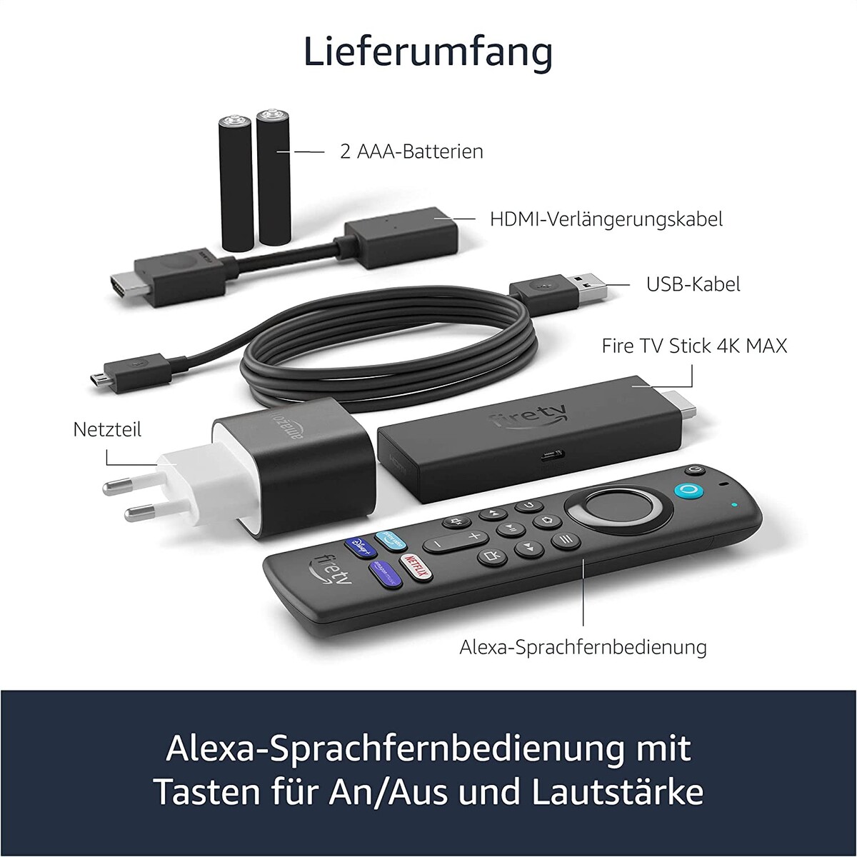 Wie schon der Vorgänger unterstützt der neue Fire TV Stick 4K Max die Wiedergabe von 4K/UHD. Er wird via HDMI mit einem Fernseher oder anderen Wiedergabegerät verbunden. Dazu unterstützt er die Hochkontrastformate Dolby Vision, HDR und HDR10+ sowie Dolby Atmos. Für die Bedienung liegt eine Alexa-Sprachfernbedienung bei. Diese bietet nicht nur Schnellstarttasten für die beliebten Streamingdienste Prime Video, Netflix, Disney+ und Amazon Music. Sondern über den Alexa-Button kann Amazons Sprachassistentin auch zum suchen, starten und steuern von Inhalten auf dem Fire TV Stick 4K Max genutzt werden.