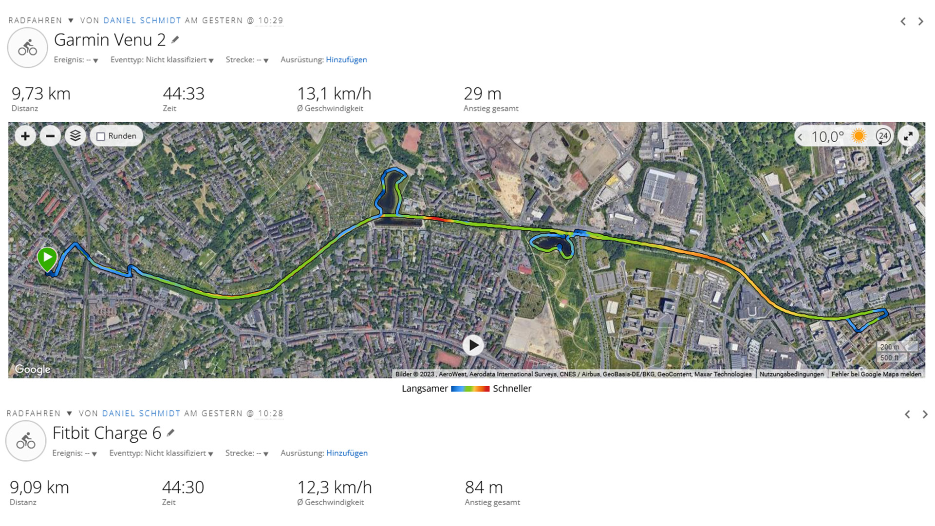 Teils waren die aufgezeichneten Routen recht abenteuerlich und es kommt auch zu einigen Abweichungen bei der Distanz, der Durchschnittsgeschwindigkeit sowie den überwundenen Höhenmetern im Vergleich zu einer Garmin Venu 2 als Referenzgerät. Hier würden wir uns wünschen, dass sich Fitbit für die nachfolgende Generation der Verbesserung der GPS-Genauigkeit widmet - so wie es beim aktuellen Modell beim Herzfrequenzsensor erfolgt ist. Praktisch und ein Pluspunkt ist hingegen, dass der Tracker auch zum Navigieren über Google Maps genutzt werden kann. Eine Wetter-App gibt es dafür nicht mehr.
