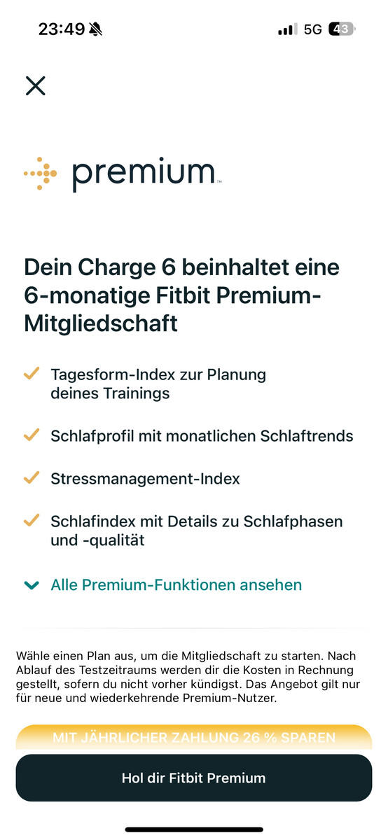 Grund für Kritik gibt es neben Dingen wie den dicken Displayrändern auch für das Verstecken von einigen Funktionen hinter der Bezahlschranke Fitbit Premium, auch wenn wir uns an solche Vorgehen wohl immer mehr gewöhnen müssen. Zudem ist ein Google-Konto zwingend erforderlich. Der Fitbit Charge 6 ist sehr stark auf die Google-Welt zugeschnitten, was unter anderem auch die teils schlampige Lokalisierung der iOS-App zeigt.