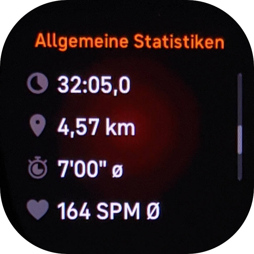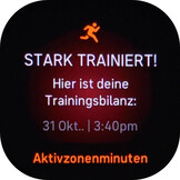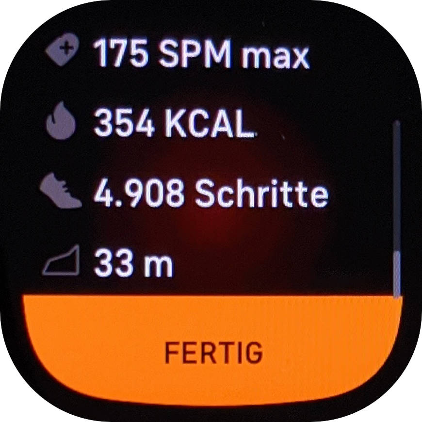 Über die Sensortaste pausiert man das Workout und setzt es fort, zum Beenden drückt man einen Softkey auf dem Display. Das funktionierte im Test auch mit verschwitzten Fingern, aber die Sensortaste ist schlechter zu ertasten als die mechanische der Versa 2. Eine Zusammenfassung wie nachfolgend abgebildet zeigt die Sense nur unmittelbar nach dem Workout. Danach bleibt das Trainingsprotokoll nur noch in der App einsehbar.