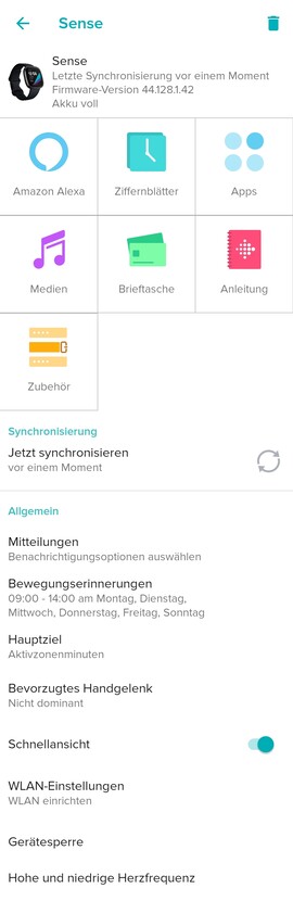 Sobald die Sense geladen ist, ist sie auch schon funktionstüchtig, zählt die Schritte, trackt ein Workout und führt einen EDA-Scan durch, zu dem wir später noch kommen. Die Sprache ist zu diesem Zeitpunkt noch Englisch und ändert sich erst beim Koppeln über die Fitbit App aus dem App Store oder Googles Play Store.