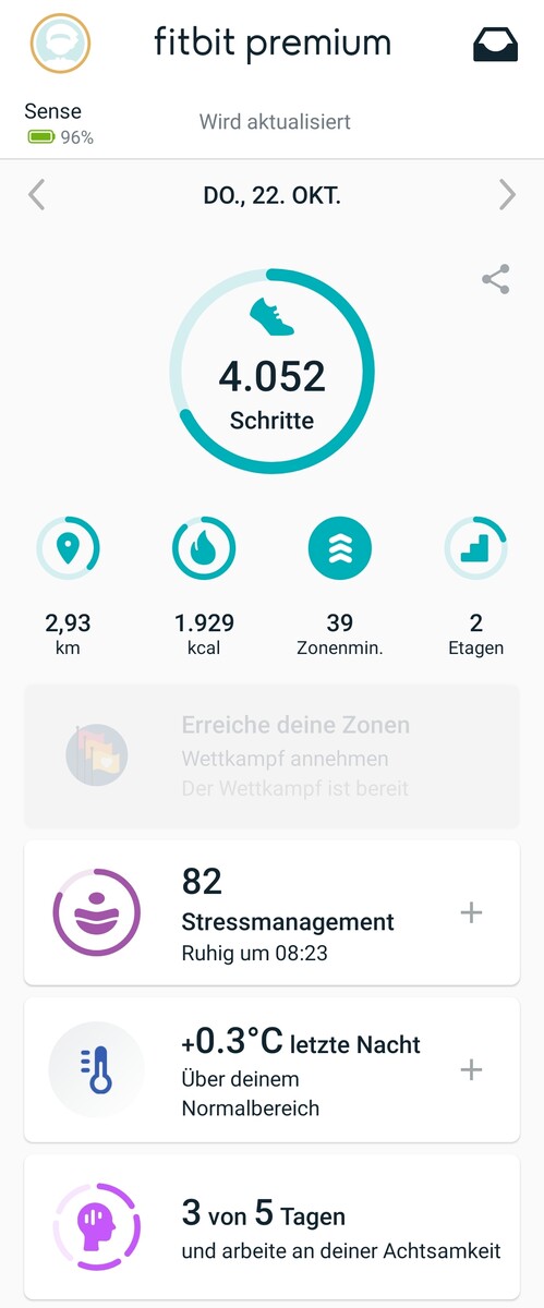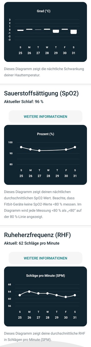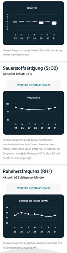 Bei der Betrachtung der Analysen bleiben aber Wünsche offen. Was beispielsweise fehlt, sind konkrete Zahlen zu Hauttemperatur und Blutsauerstoffsättigung. Fitbit arbeitet mit dem Verlauf und mit Abweichungen als Indikatoren für gesundheitliche Störungen. Das mag ausreichen und versetzt empfindliche Gemüter nicht in Aufregung über vereinzelte schwächere Werte oder den Vergleich zur Körpertemperatur, lässt sich aber nicht validieren und ist schlicht schade. Ebenso wie die Tatsache, dass man die Sauerstoffsättigung nicht auch tagsüber messen kann, zumindest manuell.