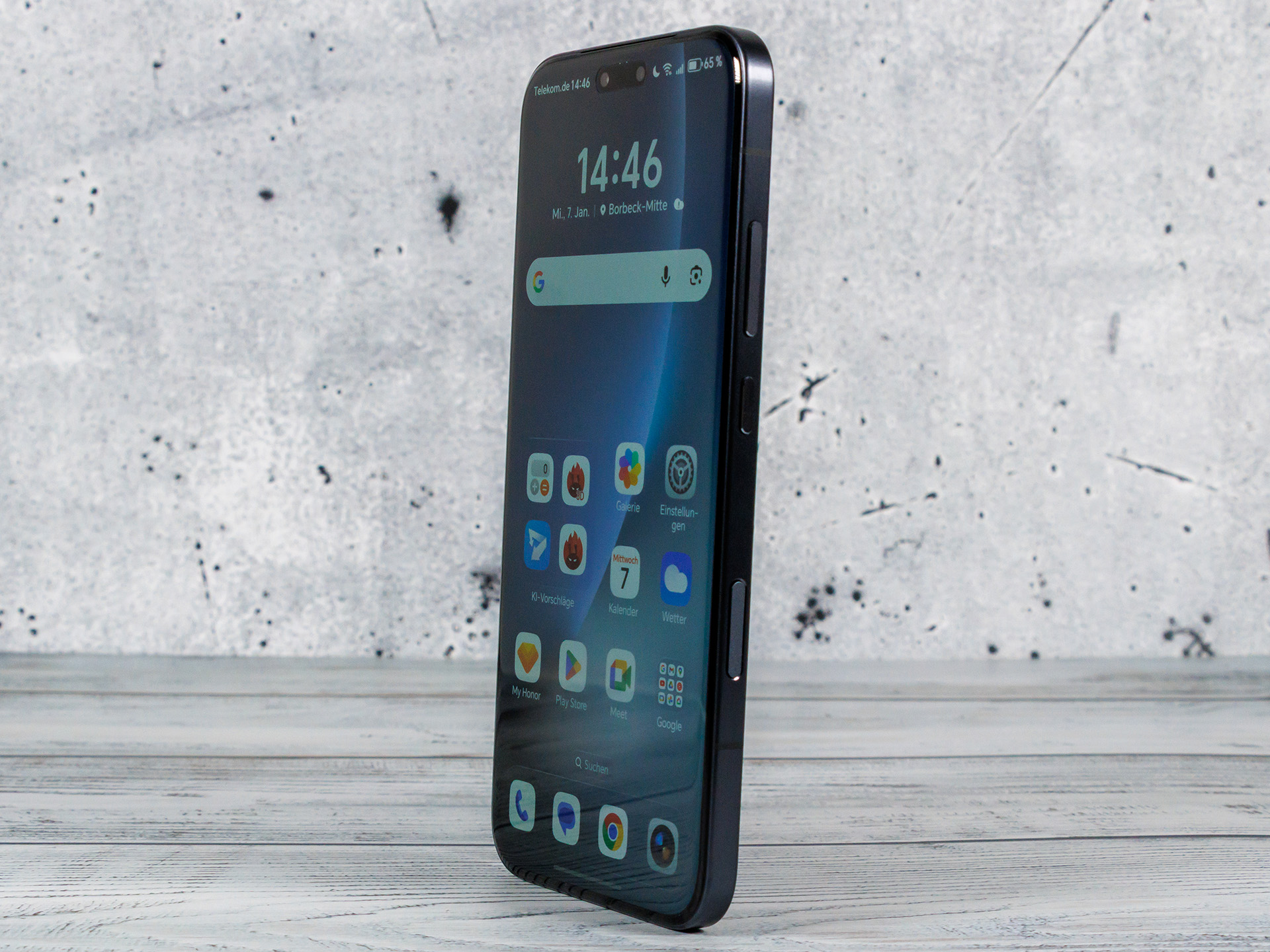 Die beiden Lautsprecher des Honor-Smartphones wollen mittels KI-Algorithmen ein räumliches Klangerlebnis mit viel Tiefe ermöglichen. Bei mittlerer Lautstärke gelingt ihnen das ganz gut und sie liefern einen ansprechenden Sound. Auf voller Lautstärker verzerren die Höhen jedoch zeitweise recht stark.